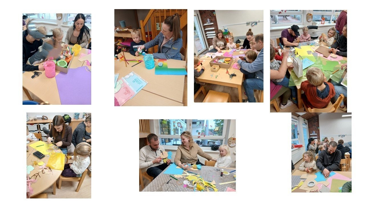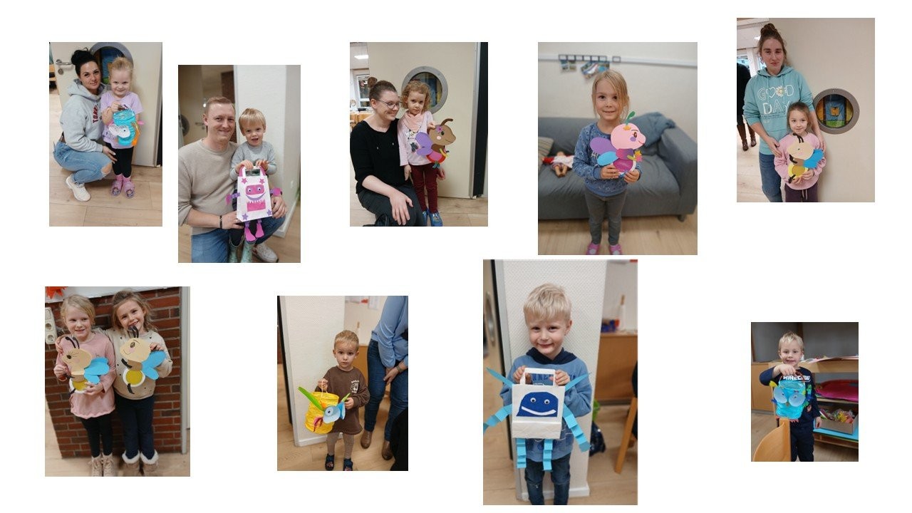 Wir laden an verschiedenen Terminen zum Laternenbasteln ein. Die Musterlaternen stellen wir aus, so können die Kinder gemeinsam mit ihren Eltern eine Laterne aussuchen. In Begleitung eines Elternteils wird dann eifrig gebastelt.