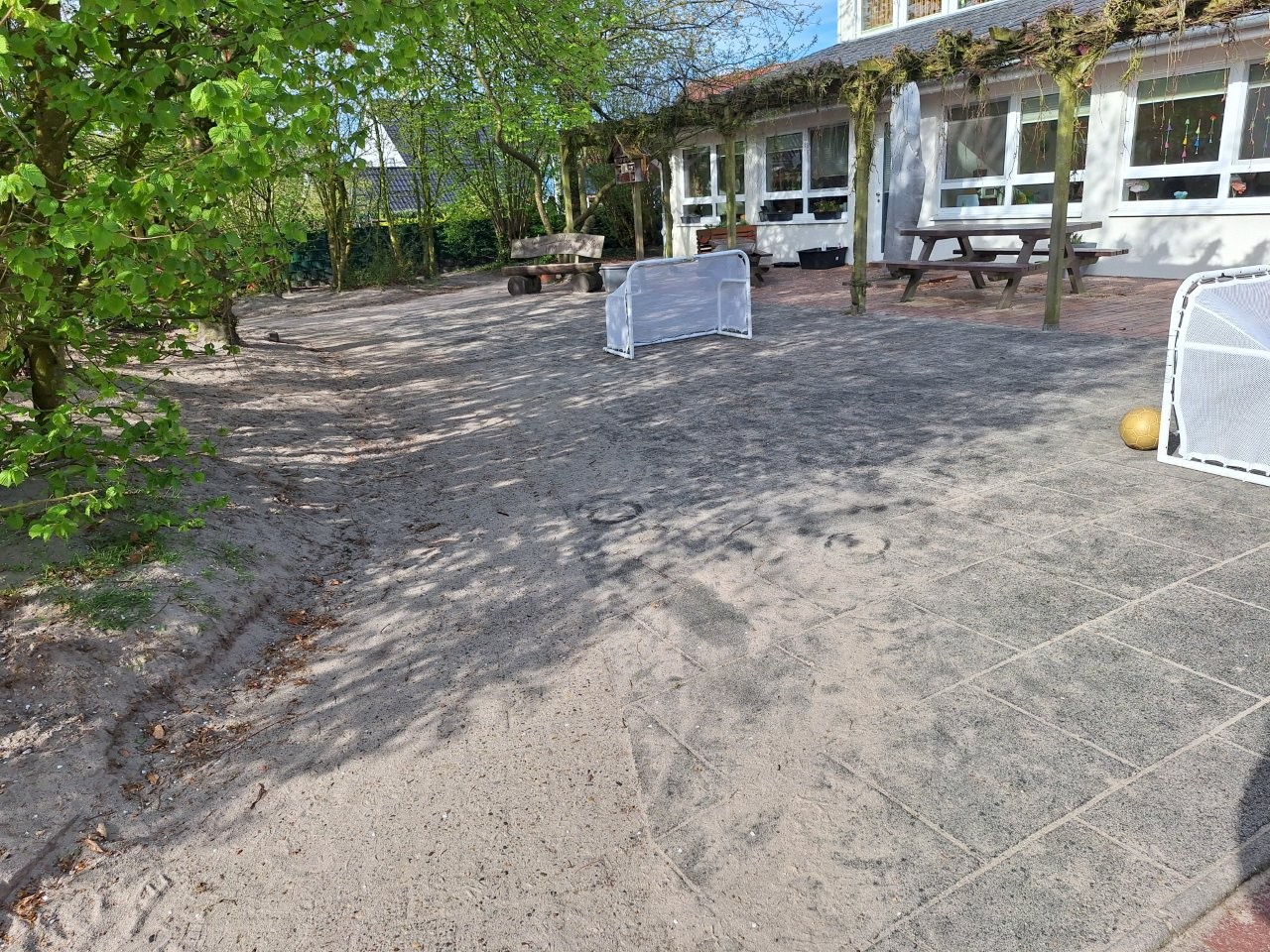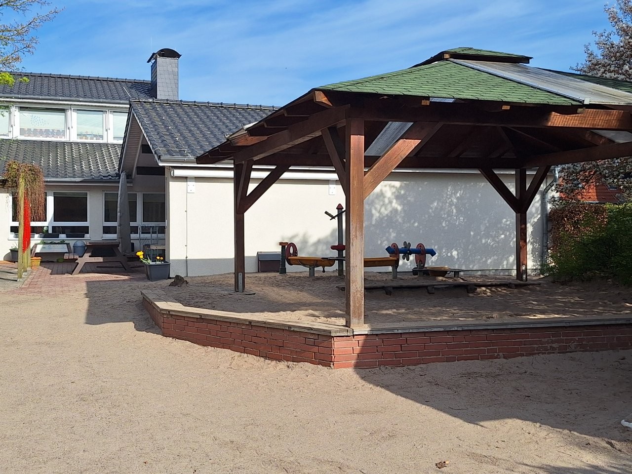 Für beide Spielplätze konnten wir Sitzgelegenheiten anschaffen. So kommt es bei schönem Wetter vor, dass der Gruppenraum nach draußen verlegt wird. Auf der Terrasse wird dann gefrühstückt, gemalt, gepuzzelt…