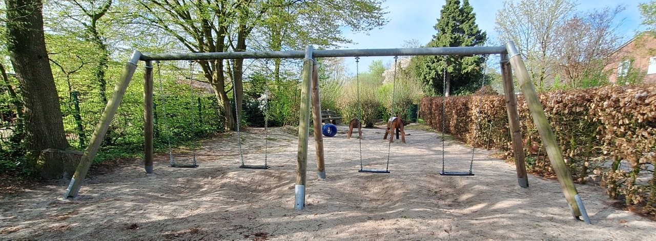 Einige Schritte vom Kindergarten entfernt, befindet sich unser „Schaukelspielplatz“. Neben den Schaukeln lädt eine Pyramide zum Klettern ein. Außerdem stehen den Kindern Holzpferde zur Verfügung und eine Sandkiste. Zusätzlich lädt ein kleiner dichtbewachsener Pfad zum „Streunern“ ein.